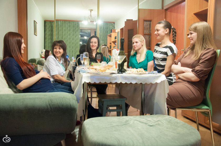 Начну с себя. Вечером 17 апреля 2015 года мы отмечали День Рождения моей подружки. Тогда срок моей беременности был ровно 38 недель. Дату родов ставили с 3 по 9 мая. Живот не опустился, чувствовала я себя веселым бегемотиком, ничего особенного. Сидели в теплой и знакомой компании (на фото компания не в полном составе). Много смеялись, вкусно кушали. И вдруг, около 22-22:30 я почувствовала сокращения живота. Подумала, что тренировочные схватки, спросила у девочек но-шпу, но ее не оказалось, решили с мужем поехать домой.