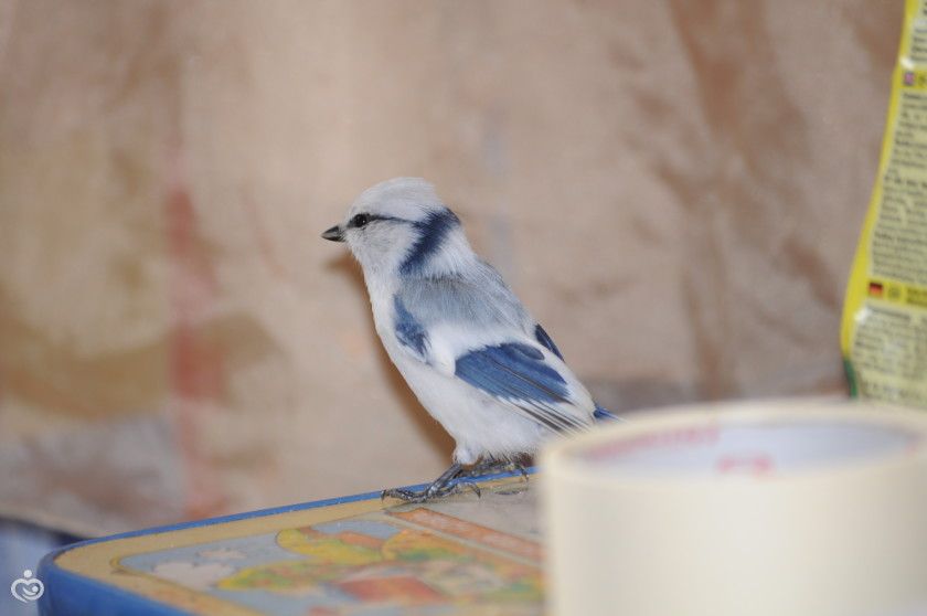 Вчера гуляли и в сугробе обнаружили синею птичку в сугробе. Да-да, с ярко синими перьями, на фото видно. Принесли домой, отогрелся птиц, песенку свою завел. Крылышко малость повреждено у него оказалось. Назвали мы нового питомца Яша, вот только не знаем, как называется это чудо)