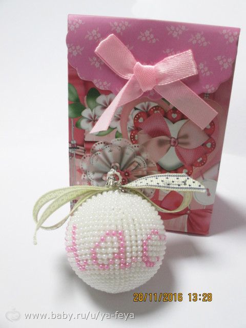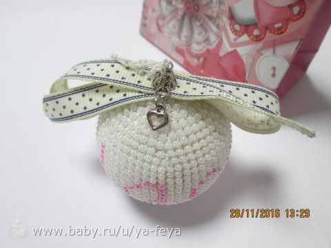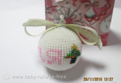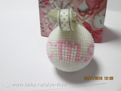 Надеюсь частичку этой радости в этом году принесет и миленький новогодний шарик своей будущей хозяйке — девочке Насте. Шарик связан крючком в технике вязания с бисером. Украшен репсовой лентой и маленькой но очень милой подвеской сердечко. Кроме имени шарик украшает рисунок в виде наряженной елочки.