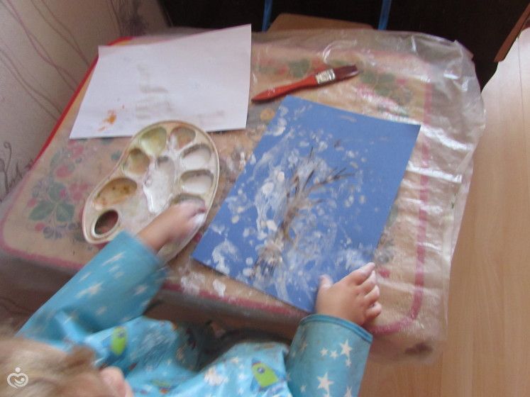 Рисуем дерево под снегом (его почти не видно оказалось), Ника выучила слово «вьюга».