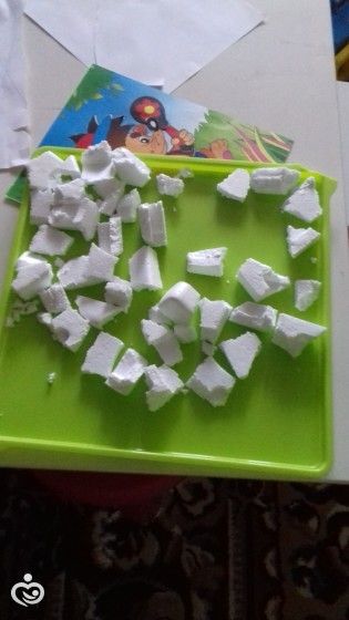 Пока я искала бумагу для «снежков», Алиса достала пенопласт, и решила, что он похож на снег. Папе понравилась идея, и пошла жара. Вот такие у них были снежки:
