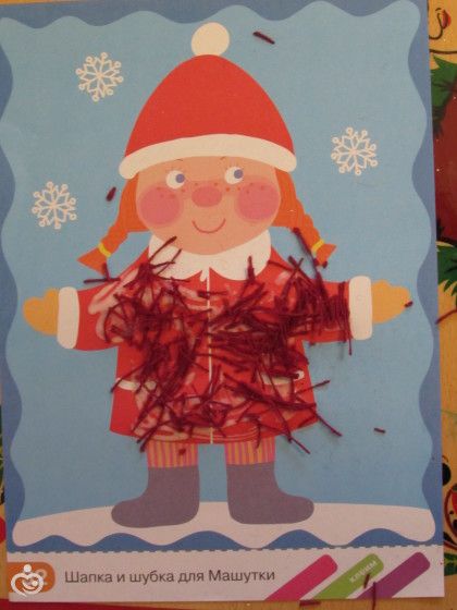 Вероника делала аппликацию из ниток «Шубка и шапка для Машутки». Но ей было не интересно, шубку еле осилила.