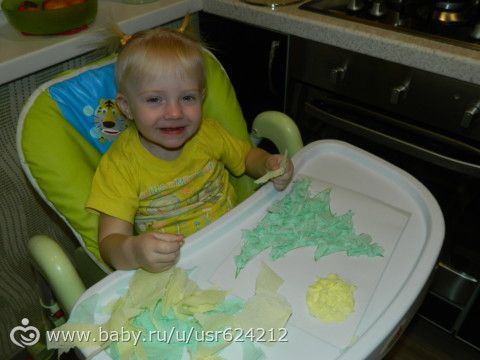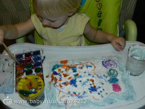 Краски только пальчиковый давала, так он за минуту все руки измажет и нервничает что грязный)