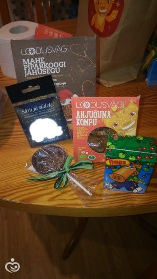Это подарок от туда, сок, горький шоколад ( дочь есть не стала его, даже для меня слишком горький, ел папа), сушеные яблоки, отражатель и самое странное это сухая смесь для изготовления печенья. Там были дети которые ходили в театр и получили такие же подарки (2-12 лет там были), уже сознательные дети были не особенно рады такому.