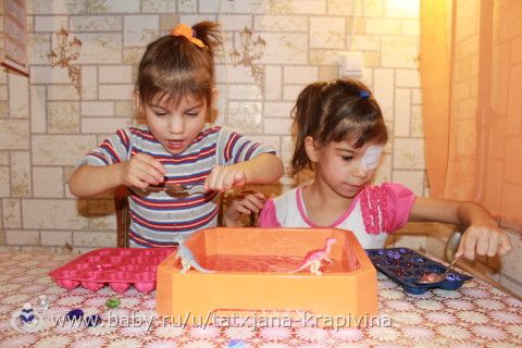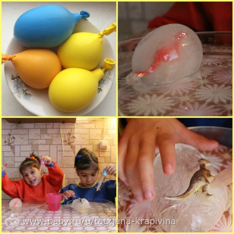занятия со льдом у моих девочек вызывают восторг. ПОэтому я заморозила в воздушных шариках фигурки динозавров, и птичек, залив их водой. Девочки топили лед этих яиц, как могли. И солили, и водой поливали, и из пипеток лили) довольные были очень)