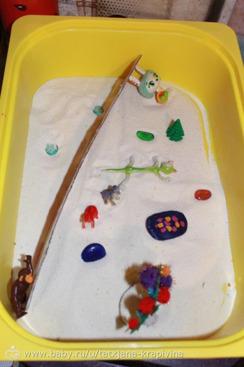 вечером я сделала сенсорную коробку, с этими же динозаврами, и их друзьями. В коробке была манка, а внутри нее насыпала стеклянные шарики, и этот факт побудил Вику копаться в манке руками) обычно она брезгует.