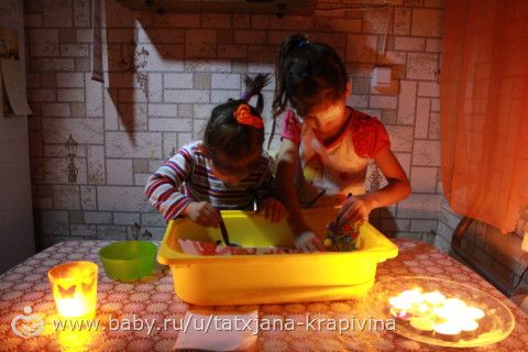 потом мне пришла идея сделать мини световой стол) Эту емкость с манкой я поставила на тарелку, во внуть которой положила фонарик) и девочки рисовали пальчиками, получилось здорово!
