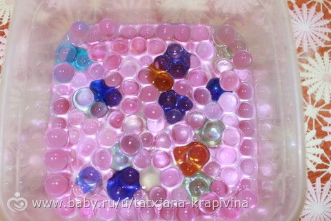 а здесь мы уже занимались с нашим любимым гидрогелем — аквагрунтом. И руками трогали, и ложечкой перекладывали в формочки для льда