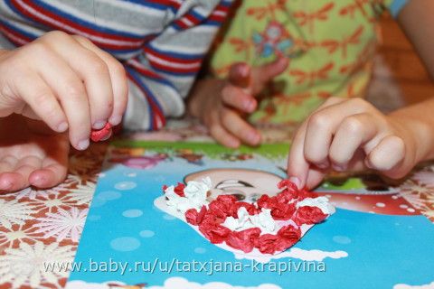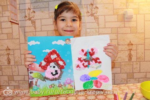 из подаренных бабушками приятностей, мы делали поделки) очень интересное занятие было — делать шарики из бумажек, и приклеивать на рисунок. Обьемный рисунок получается. Мы сделали мухомор так, а бумажки остались. Дополнительно сделали шариков из обычной салфетки, я нарисовала бабочку, и еще одна аппликация готова)