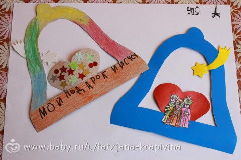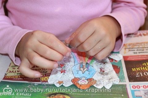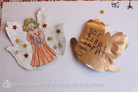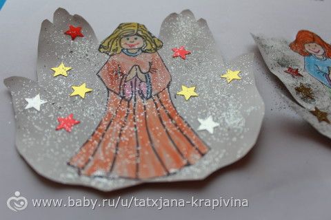 Еще мы делали вот таких ангелов. Крылья — обведенные руки Вики и Маши (мы делали 2 ангела)