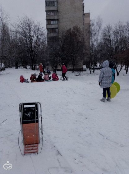 Все дни дети проводят на горке рядом с домом. Полине уже не боится съезжать, пристраивается ко всем паровозиком