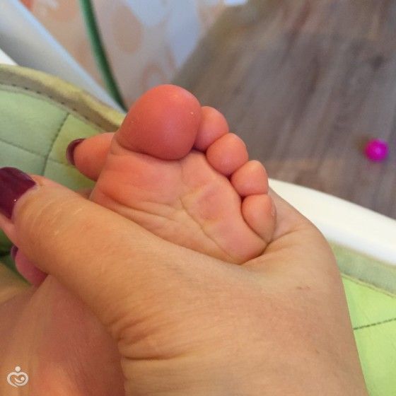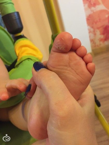 В период тестирования каких-то критичных проблем с кожей у Златы не было. После ванной с использованием Эмульсии и Кремового геля кожа доченьки была увлажненная, бархатистая, приятная на ощупь, вобщем такая, какая в идеале и доожна быть у маленького карапуза. Крем я решила протестировать на жутких Златкиных мазолях, которые образовались на подушечках больших пальцев ног. У нас начался период активного хождения, носочки упорно Златой снимаются, ходим босиком, благо в доме система теплый пол. Вобщем вот, что было ДО