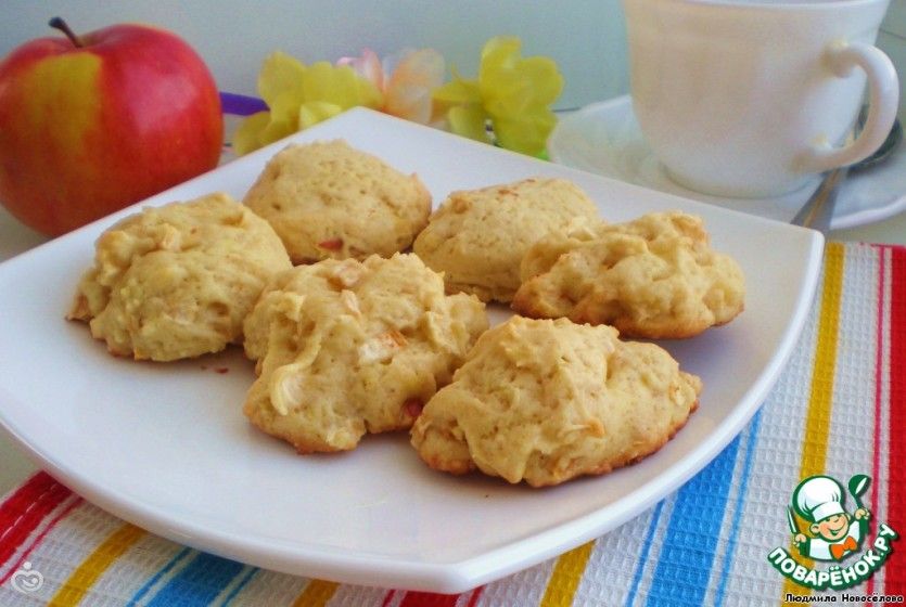 Духовку нагреть до 180 градусов. Пока греется, взбиваем размягченное сливочное масло с сахаром, добавляем яйцо, взбиваем до пышной массы (я взбивала минут 5). Добавляем просеянную муку с разрыхлителем, корицей, ванилью, соль. У меня тесто получилось густое, как пластилин. К рукам почти не липнет. Яблоко чистим, нарезаем мелкими кубиками (я думаю можно и на крупной терке натереть), подмешиваем к мучной массе. Противень смазать растительным маслом и ложечкой выложить тесто. Я выпекала на фольге, ничем не смазывая. Отправляем в духовку на 10-15 минут. Печенье должно схватиться, но само остаться мягким. Получается ароматное, нежное печенье. У меня вышел противень — 24 печеньки