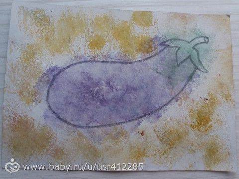 А дома делали баклажан тоже губкой, но в интересной технологии.Сначала смачиваем обильно картон и карандашом прорисовываем контур того что вы хотите, у нас был баклажан.
