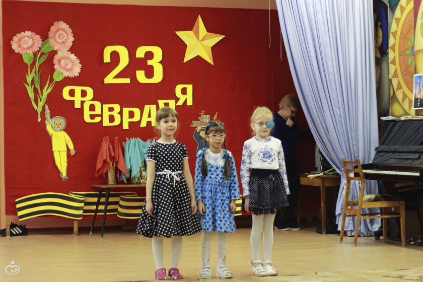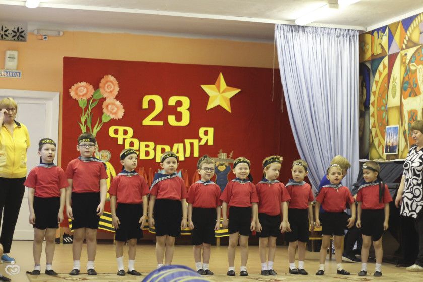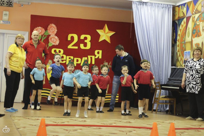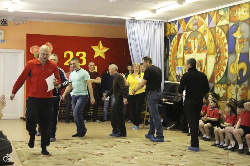 на следующий день был праздник в честь 23 февраля. Очень здорово было, позитивно. Радовало количество пап и дедушек, которые принимали участие тоже в празднике. Девочки только по стихотворению рассказали, все остальное действие производили мальчики)