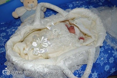 Я решила конверт не брать. Он потом не нужен будет. Взяла красивое одеяло и ленточку, зато сейчас его в кроватке им укрываем ))