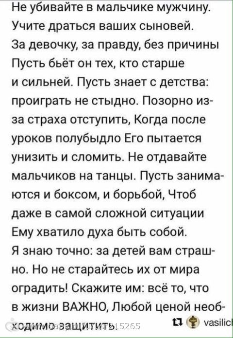 Нравится ))) немного однобоко но в целом да. А то маменькиных сынков растят. На детских площадках чуть что бегут помогать сыновьям отобрать свою игрушку! Жесть. Курицы.