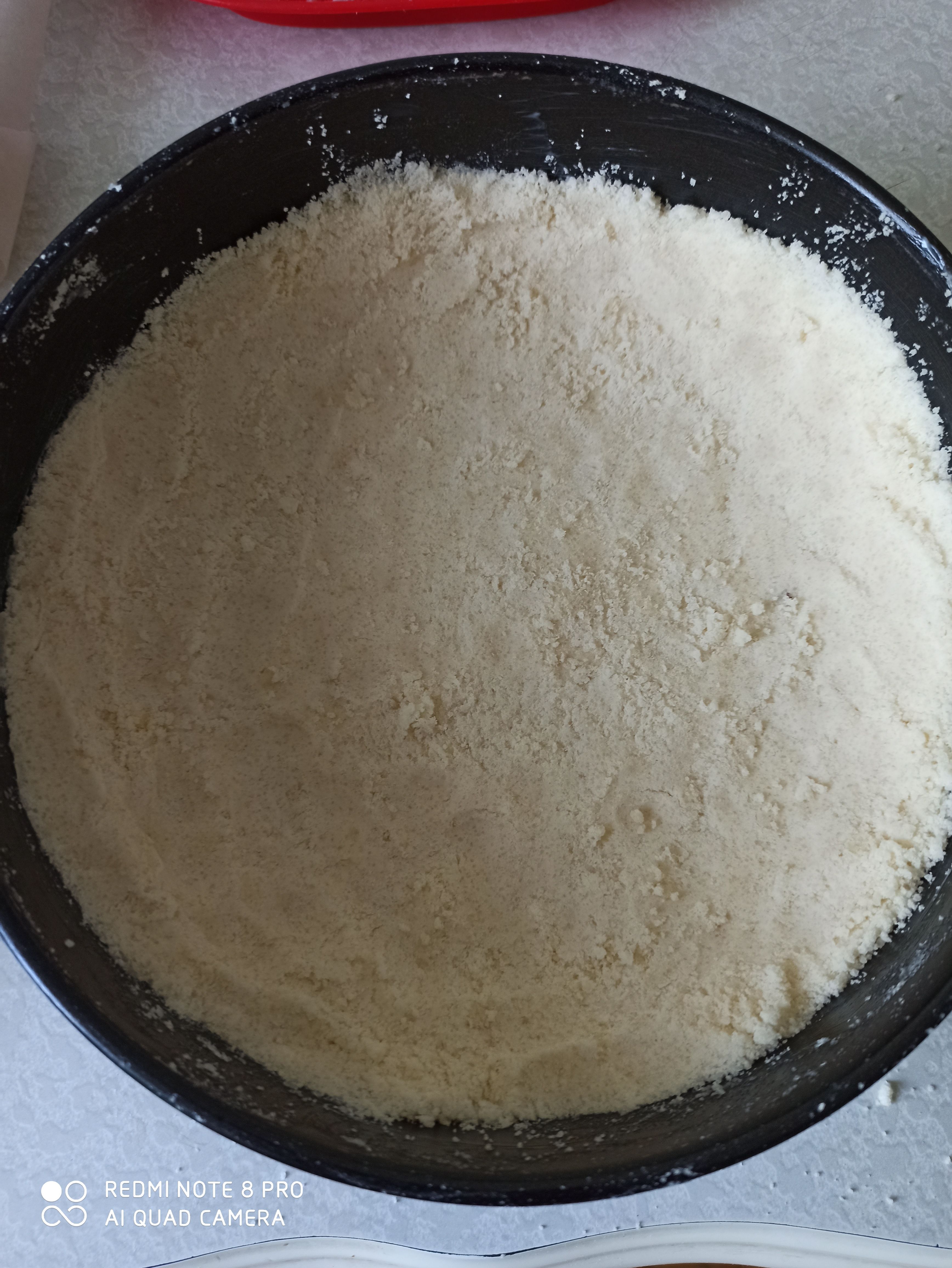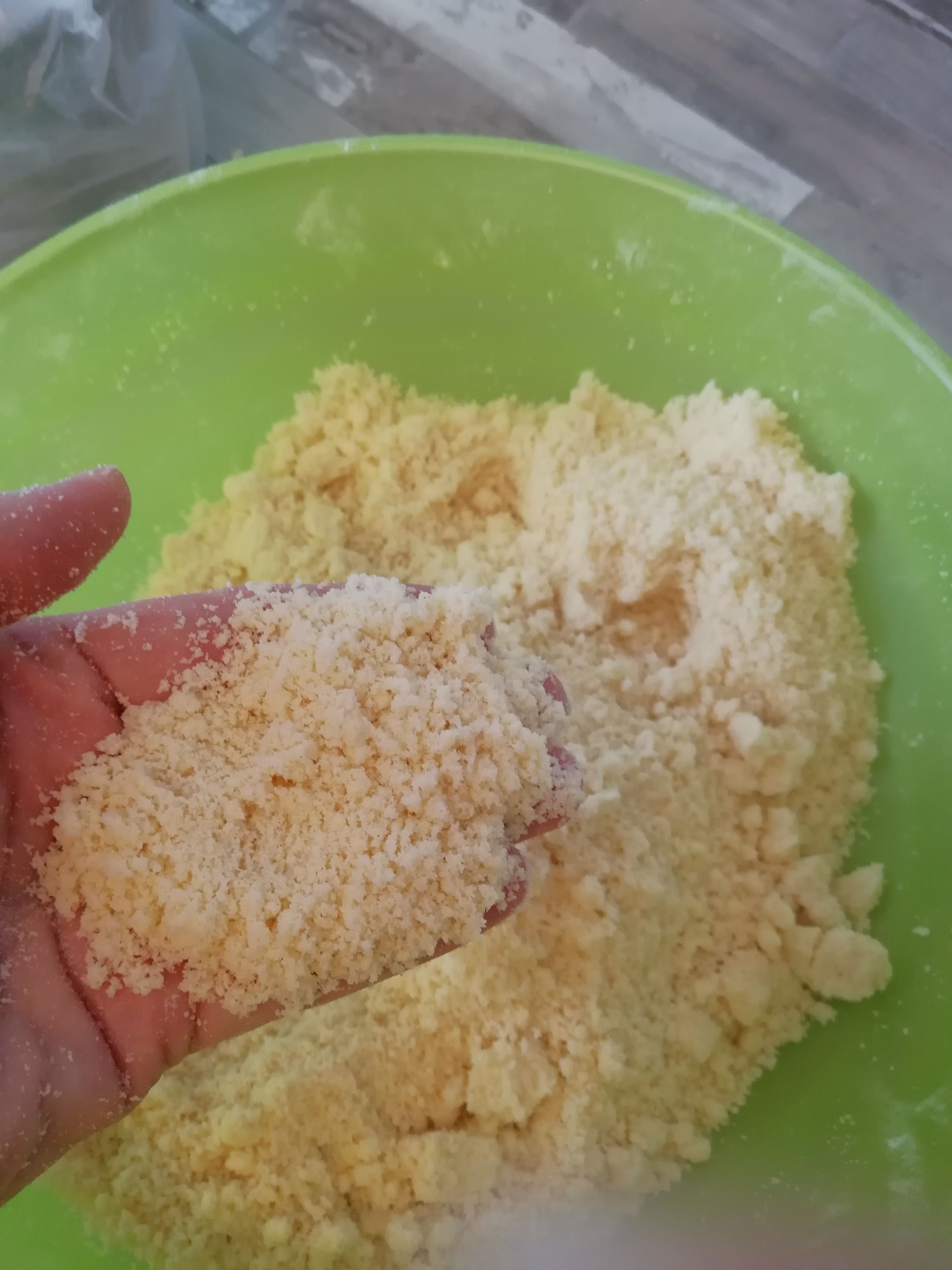 Измельчаем на крупной терке масло (масло плотное, но не замороженное). Добавляем сахар, муку и соду (или разрыхлитель). Ложкой растираем масло и муку, получилась крошка.
