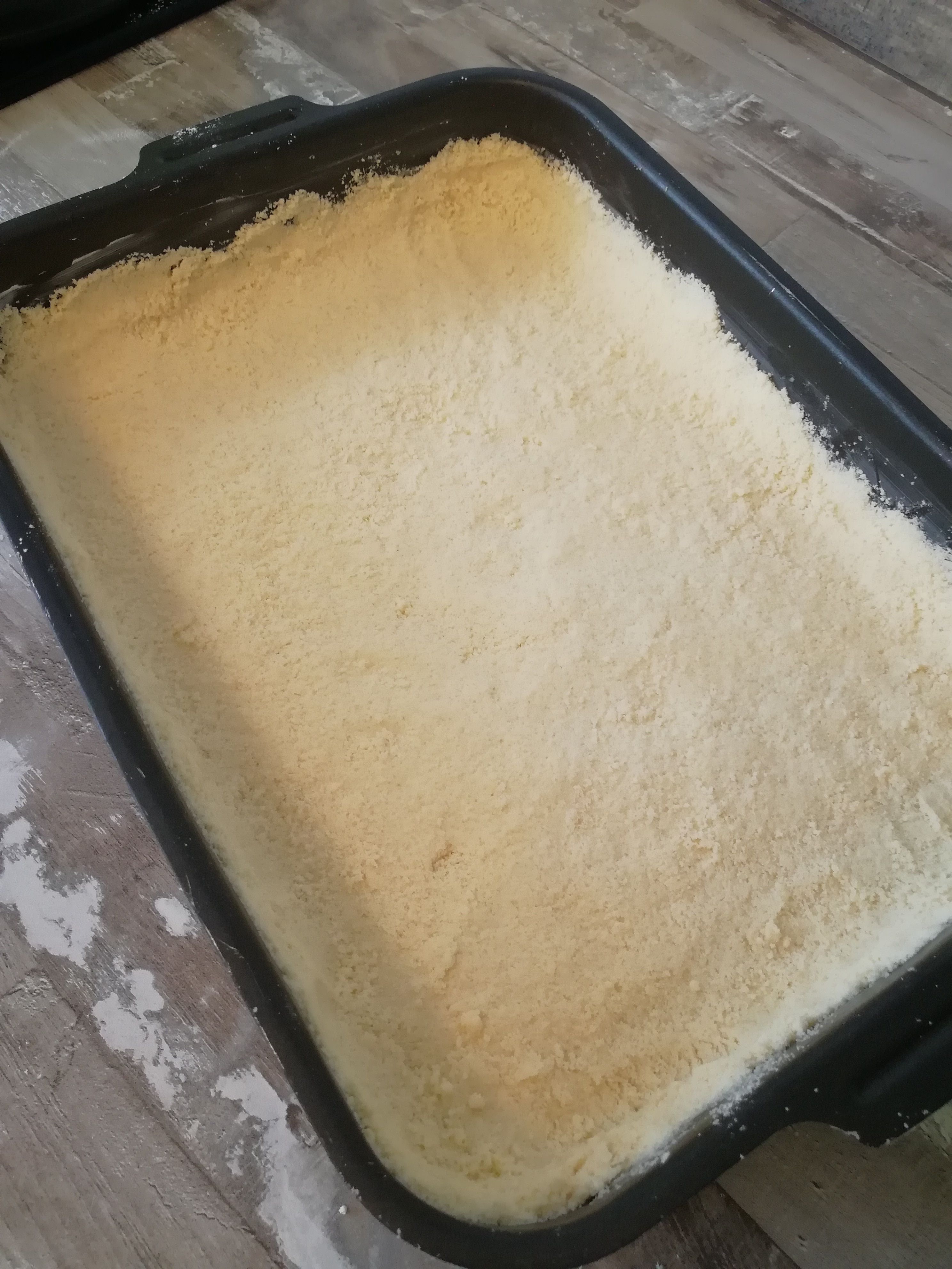 В смазанную маслом форму выкладываем половину крошек теста. Разравниваем. Выливаем начинку. Все это закрываем оставшимися крошками. Ставим в разогретую до 200 градусов духовку. И держим до подрумянивания. У меня стоял минут 40-45.