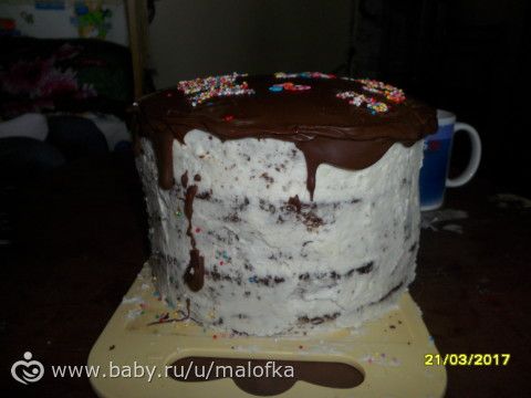 С глазурью лоханулась, передержала ее, и она замерзла раньше времени, не успела растечься по торту красивыми потеками, ну в принципе и ладно, главное, что тортик был оч вкусный :)