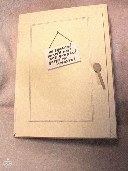 Вот очень я хочу в отпуск, отдохнуть от декретного отпуска. Устала неимоверно, стала часто болеть. Одна беда, в декретном не платят и на обычный отпуск у меня нет средств. Поэтому единственное желание, которое мне по карману, но не менее желанное — это выспаться. Думаю такое желание есть у очень многих)) И вот в мечтах о «выспаться» сделала такую открытку. Чувствовала себя столяром и мастером по установке дверей))) Кстати замочек на дверке отпирает-запирает, всё как положено.