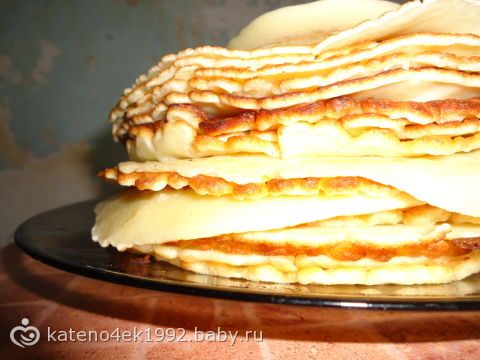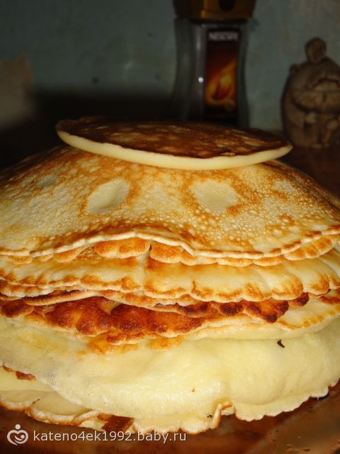 необходимо: 2 яйца, 2-3 сто.ложки сахара, 2 стакана молока, 2 стакана муки, 1/4 стакана растит.масла, 1 чайная ложка соды, гашеной уксусом.