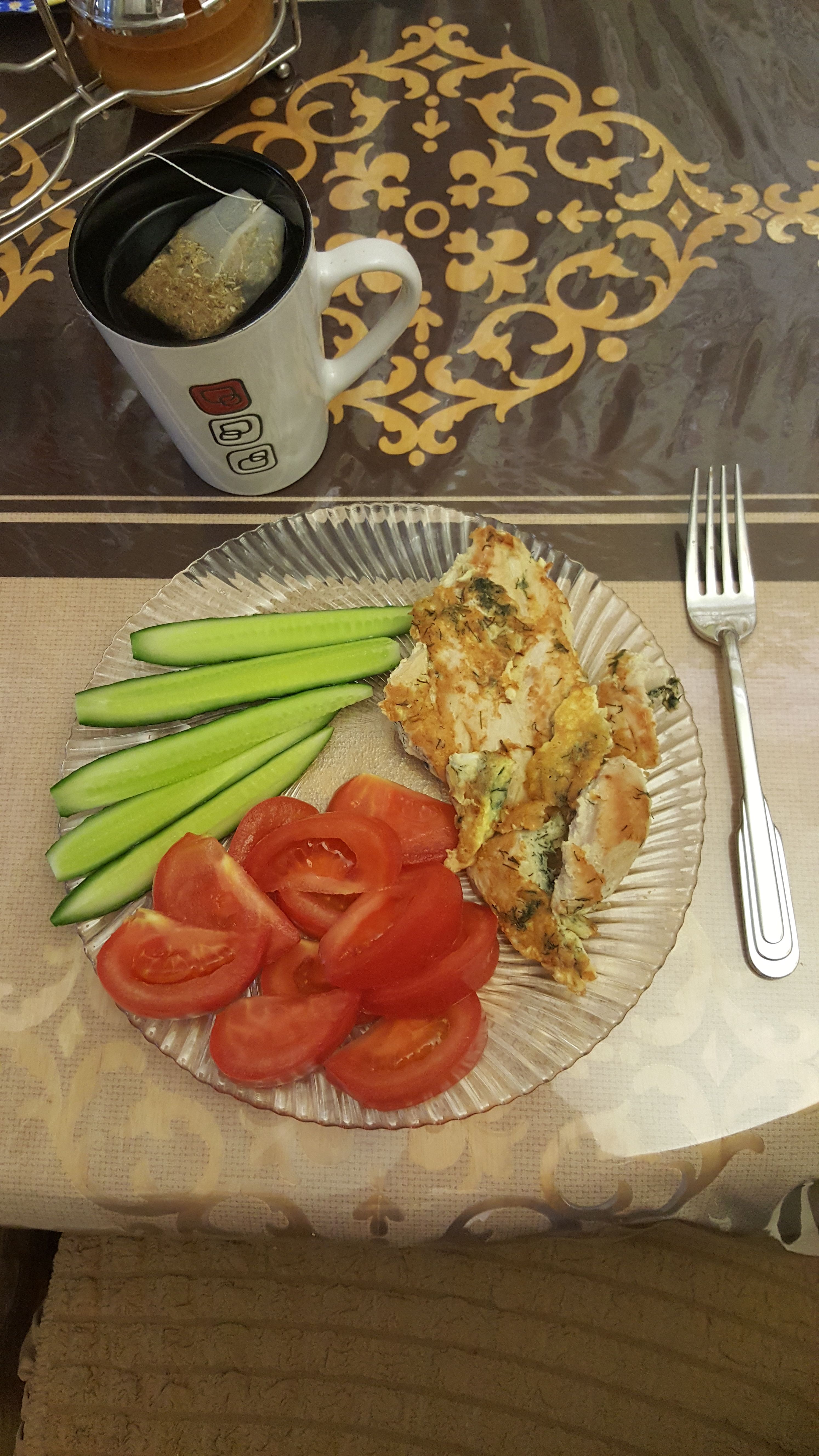 Завтрак: яичница с овощным салатом и кофе черный без сахара