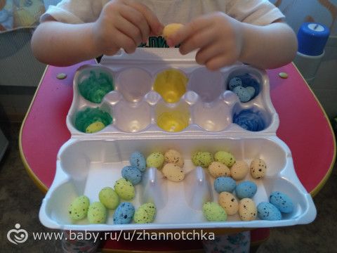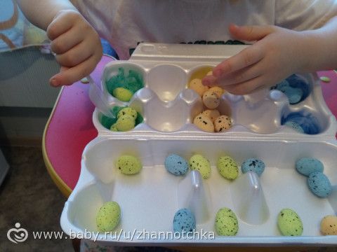 2. Другим заданием было работа с сортером и яичками. Я раскрасила по цветам упаковку из-под яиц и попросила Полину разложить яички по ячейкам: