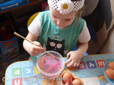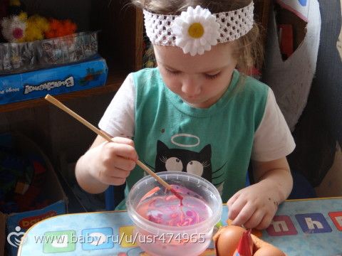 4.игра с прищепками. она уже выросла с них, заменили покраской яиц.Видела. как красили чашку. с помощью лака на воде.Решили повторить на яйце.Налили лак в воду, начали рисовать, увлекательно