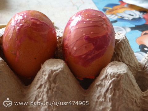 зеленые прям раскрасивые, яица смешные получились, помню смотрела как ногти красили- капали лак на воду, со стороны так просто и ловко получалось… потом сама попробовала..., ну да не буду о грустном..))