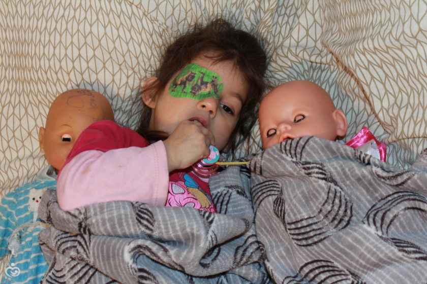 при этом диагнозе почему то очки не носят, видимо они не помогают. Мне объяснили, что она не видит по бокам, и размыто видит впереди, без обьема, поэтому не может правильно определять расстояние, и ей тяжеловато, например, нанизывать кольца на пирамидку, не сразу попадает. И еще постоянно везде стукается, и падает, раз не может определить расстояние до стены, например. Дома уже лучше, она привыкла и нормально ориентируется, но все равно стукается часто. Ну и плюс спастика ног, неустойчивая походка… Ох, меня не в ту степь понесло