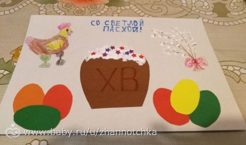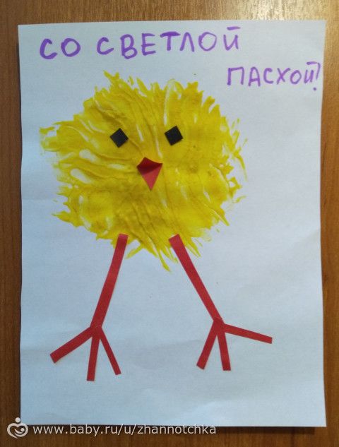 1. Первым заданием было сделать пасхальную открытку. У меня давно было желание предложить доче нарисовать цыпленка с помощью вилки, идею подсмотрела в инете, и вот решила, что самое время. Оказалось, очень забавное занятие. Вот такой у нас цыпленок получился: