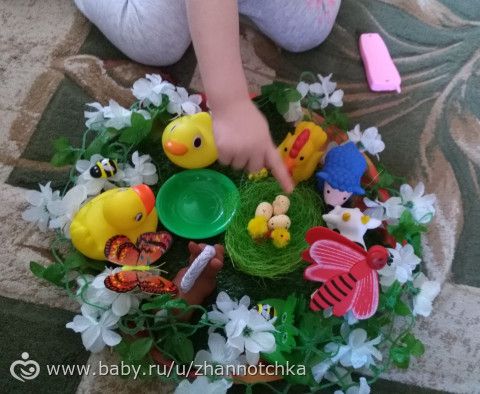 2. Далее собрали сенсорную коробку, я назвала ее «Скотный двор», собрав в нее домашних животных и птиц. Доче очень понравилось, сначала всё разглядывали, перечисляли, показывали, называли, кто как разговаривает. Потом Полина долго играла отдельно со зверюшками.
