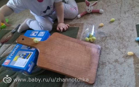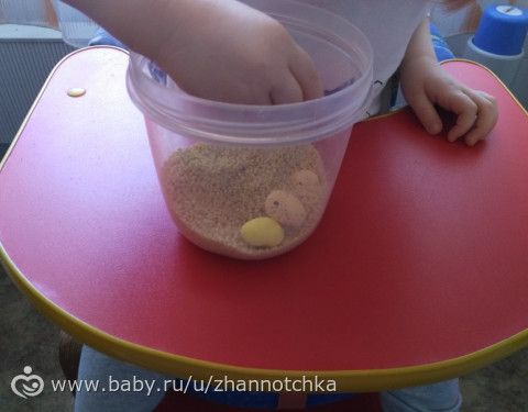5. Провели игру «Поиск яичек». Насыпала в банку пшено, спрятала в него яички. Как ни странно пшено заинтересовало дочу больше:))