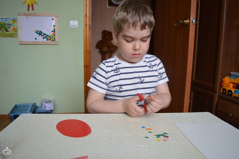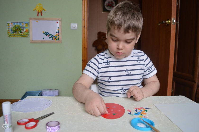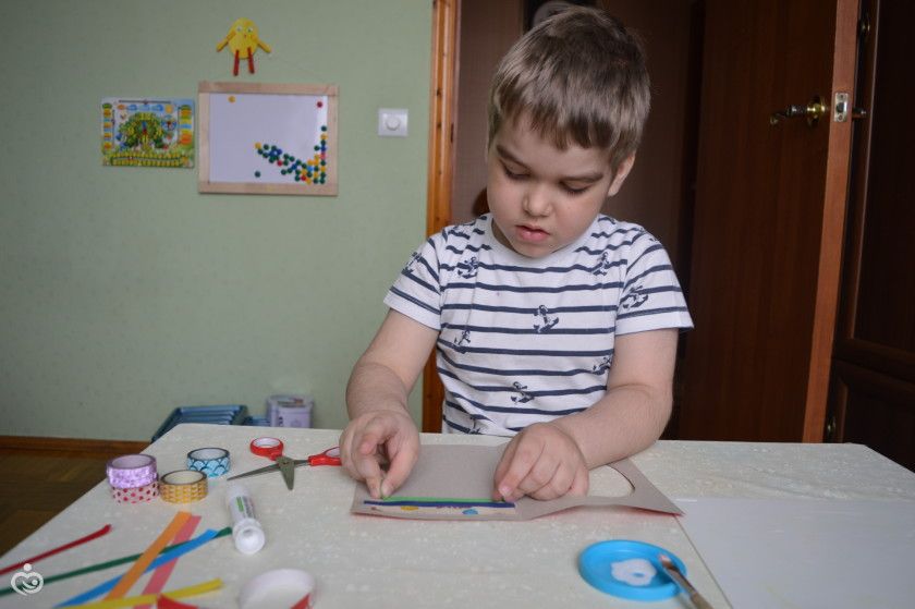 Решили сделать не сложную, с окошком и полосочками. Я подготовила заготовки, Дима клеел и бумажные полоски,