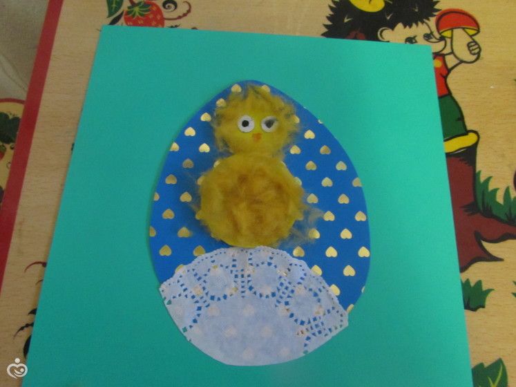 Делали открытку. Вероника клеила крупные детали и шерсть на туловище цыпленка