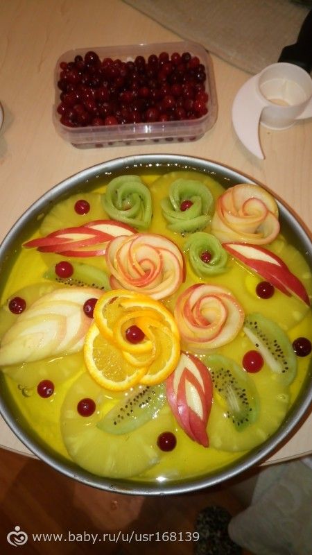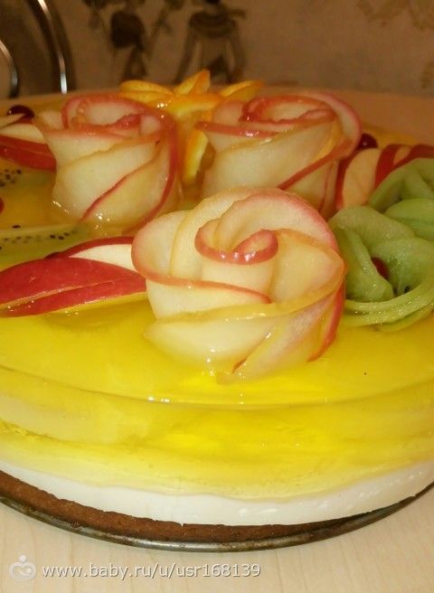 Торты вообще не моё. Бисквиты там и т.п. Моё -это рулетики из лаваша. Все на этом. А, нет. Ещё я мастер выпечки из готового слоеного теста. Это мой уровень. Но, в этот раз, я прыгнула выше своей головы! Нижний корж все-таки бисквит. Его я пропитала ананасовым сиропом.Второй слой творожно-сливочный. Затем слой ананасов из банки. И покрывает все желе+цветы из карамелизированных яблок и других фруктов. Получилось не только красиво, но ещё и очень вкусно! Все гости меня хвалили!)Так приятно!)