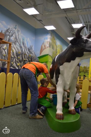 Подоили корову, по ходу поговорив о ней, о молоке, о продуктах которые из него делают, о детёнышах и т.д.