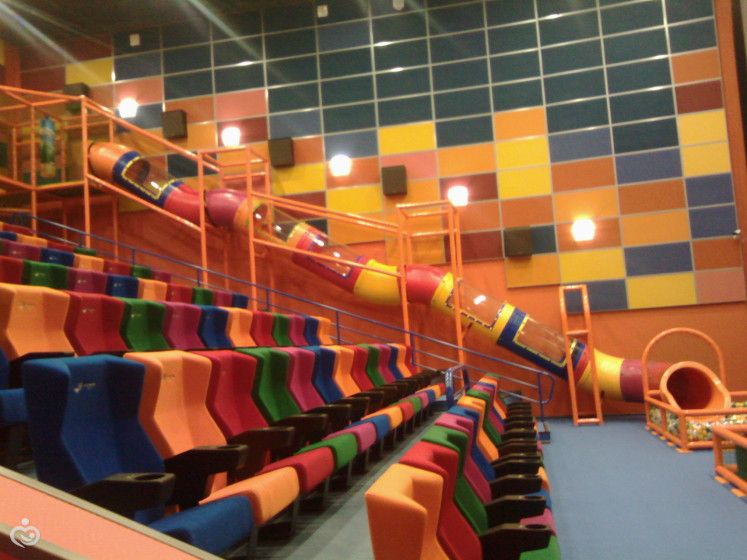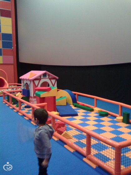 В кидзал можно прийти заранее и посидеть там(конечно если не идет трансляция фильма перед Вашим) например между сегодняшними сеансами была разница 2 часа. Т.е если вы либо с первого сеанса, либо пришли на второй-можете побаловаться. Горка высокая, нет в ней отверстий(может я не нашла)-труба. Во время просмотра кино пользоваться ей запрещается. Но внизу(перед экраном) мягкий коврик-домик-загончик))там можно и во время сеанса сидеть(но маловат он конечно… Детей 5 нормально будет, дальше мне кажется тесновато)