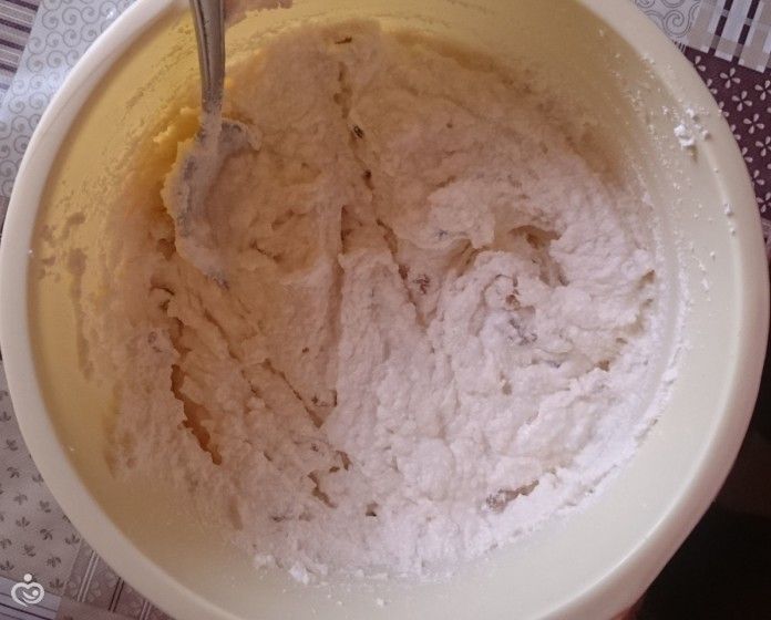 2. Смешайте и разотрите творог, манку и сахар.