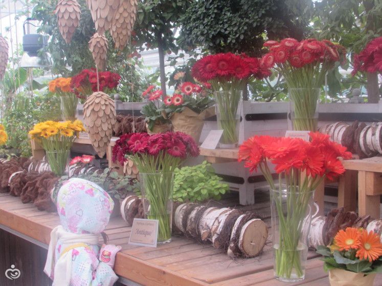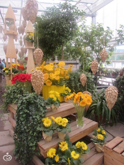 Погуляв по территории сада, мы пошли в небольшую оранжерею, где проходила выставка гербер. Ане больше всего понравились эти деревянные декоративные шишки.