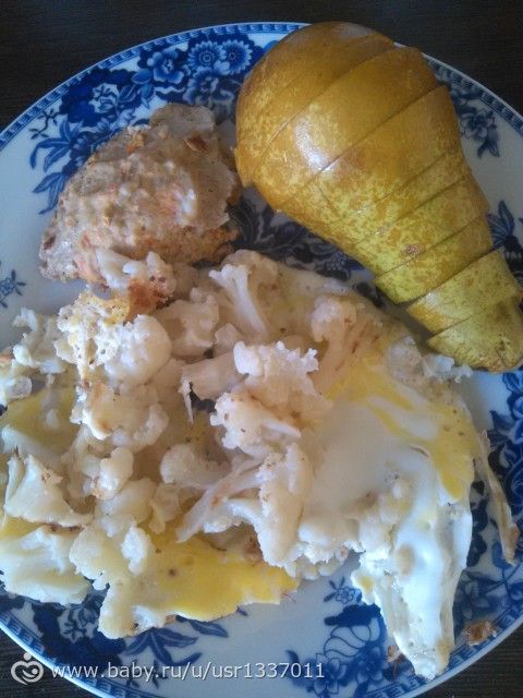 8.30 Омлет с цветной капустой: 1 яйцо, молоко 1,5%, 100 гр капусты, 1 ч.л. оливкового масла; 1 котлетка из индюшиного фарша с морковкой и груша.