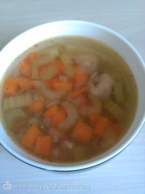 12:30 Овощной суп с фрикадельками из индюшиного фарша, чай черный без сахара 200 мл