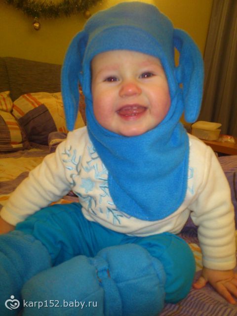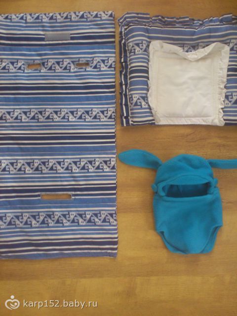 Это для коляски был матрасик и подушечка. В шапочке сейчас ходим, у нее манишка на пуговки к шапке пристегивается. И длинные заячьи ушки.