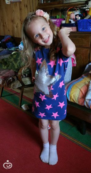 Ну и в завершении нашего дачного пребывания, я купила своей звезде звёздное платье и она в нём ходила целый день не снимая, да ещё я ей кудри сделала щипцами, на что муж смотрел на меня искоса, а мы с Аней говорили ему — красота требует жертв!