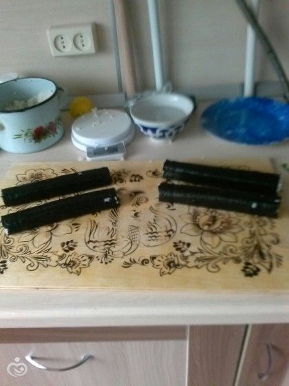 Роллы с огурцом, соусом терияки и кунжутом.И курица терияки(маринованная в соевым соусе, мёде, апельсиновый сок, лук, чеснок)запекается в фольге в духовке. 150-180 градусов.минут 20-30)
