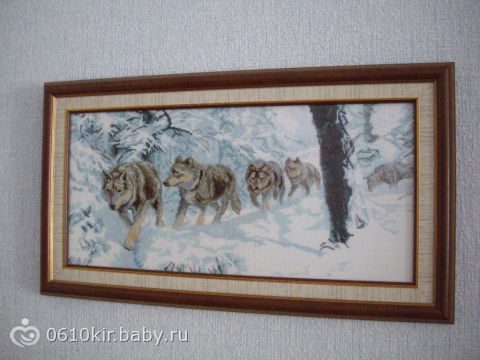 Оформили в багетке аккуратно.Правда, багет(двухцветный)немного не совпал с тем, что я хотела.Светлая часть-полностью.Темная-слишком темная.Подбирала под мебель Кирюшину, она немного с краснинкой, а багет темно-коричневый, когда увидела, даже подрасстроилась.Наверно, невозможно идеала добиться в этом деле.