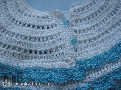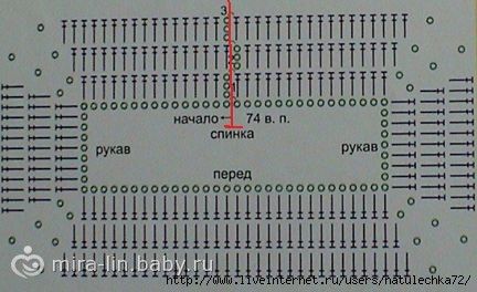 Я набирала 120п (нитки ирис тонкие). Через 16р вязание разделить на 3 равные части: перед, спинка и одна часть делится на два рукава (хотя я сделала перед и зад чуть меньше, чем рукава). Далее вяжем 17р переда, пропускаем нужное количество для рукава и присоединяемся к задней части. Ширину платья можно регулировать через прибавления СН, поэтому все на ваше усмотрение. затем в первый ряд платья вдеть шнурочек