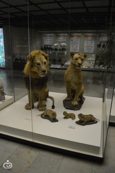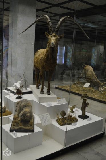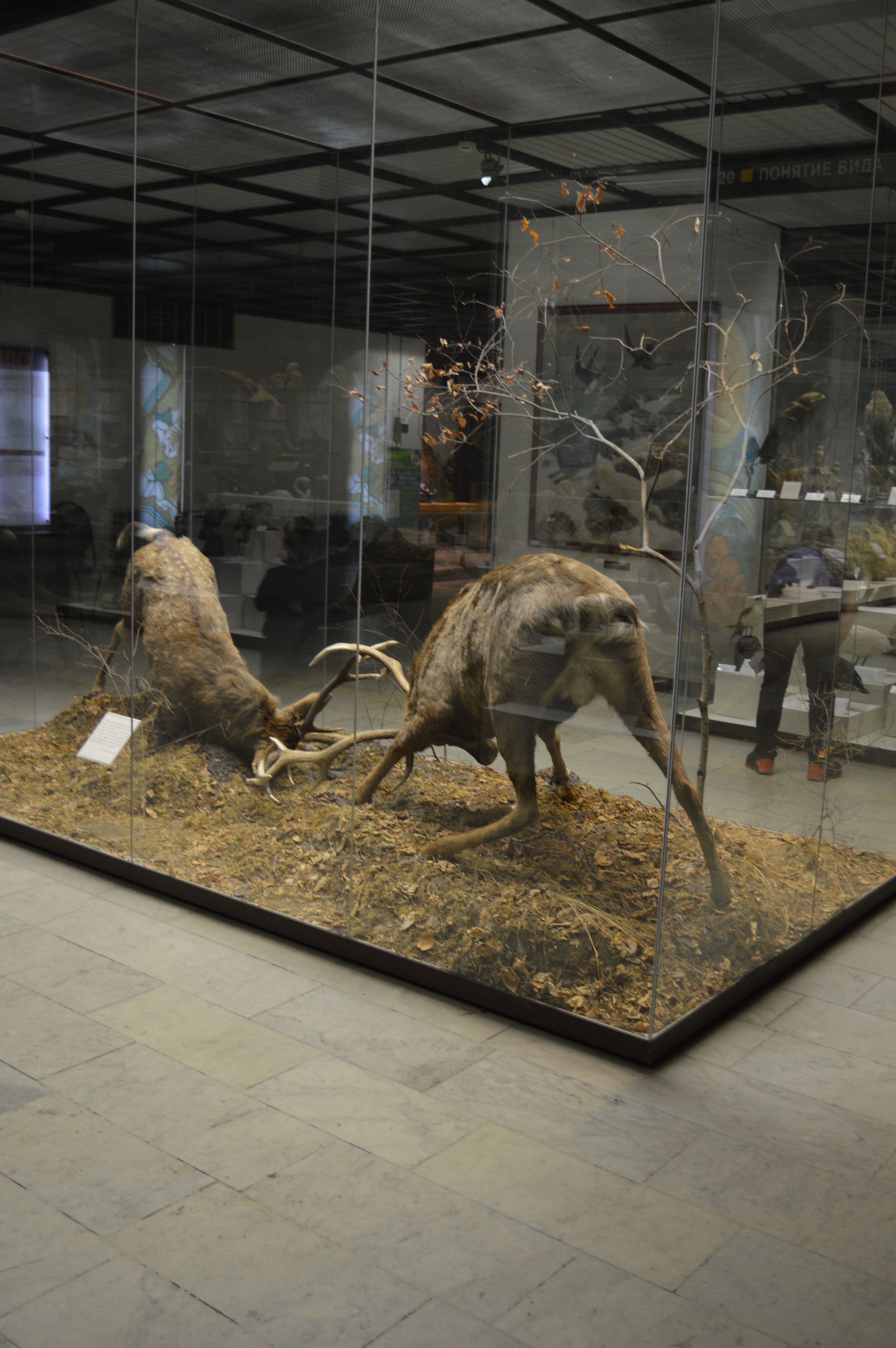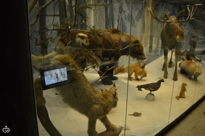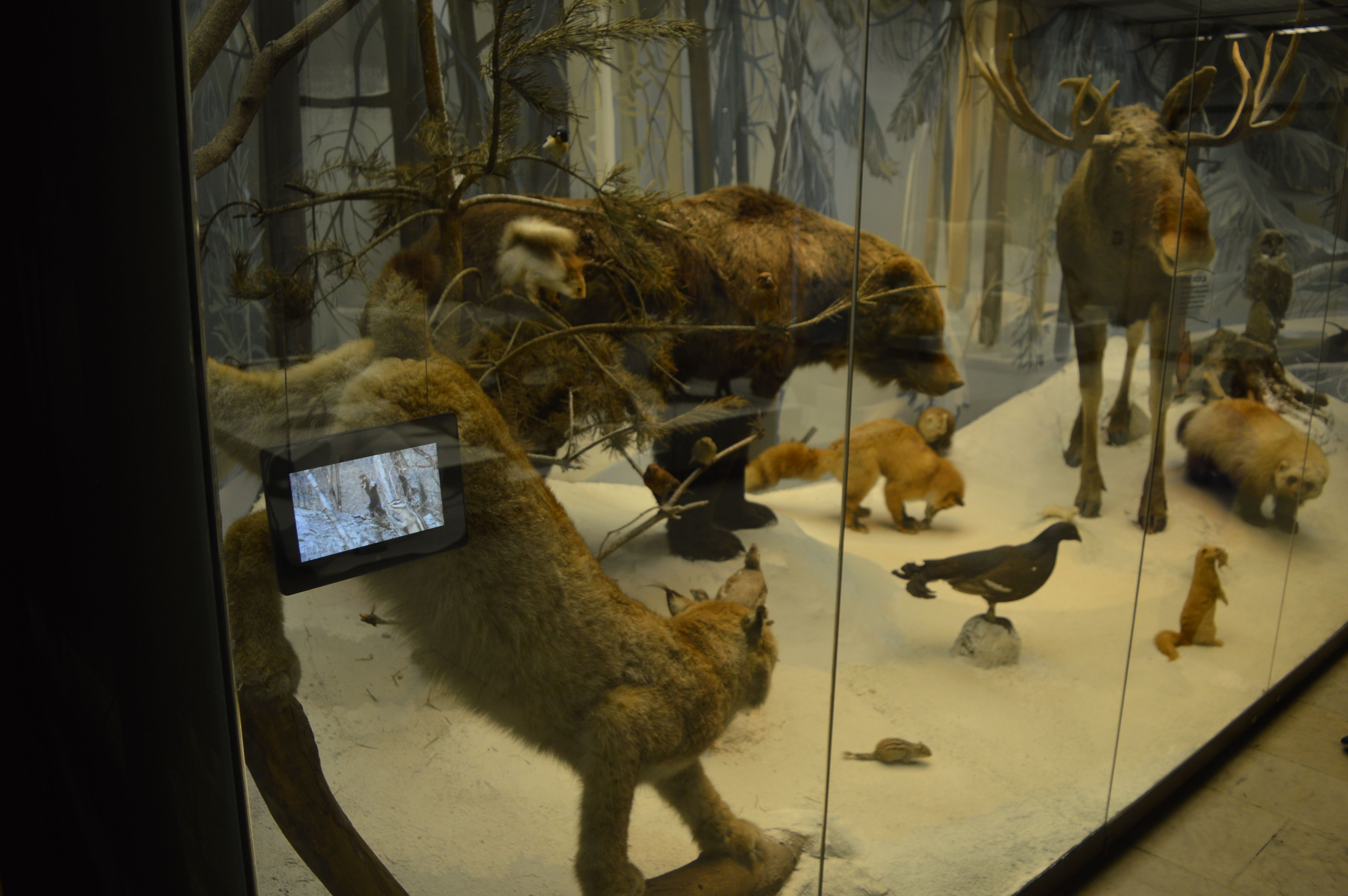 Возле витрин небольшие экраны, на котрых показывалась жизнь этих же животных в природе.