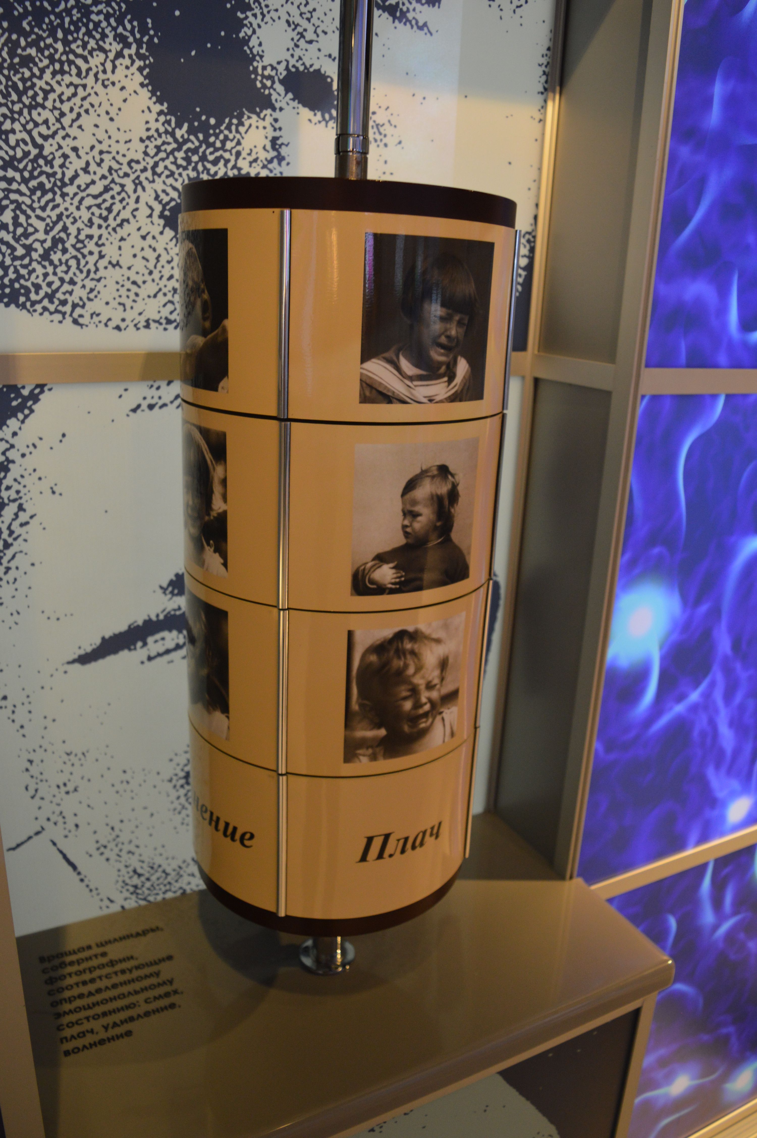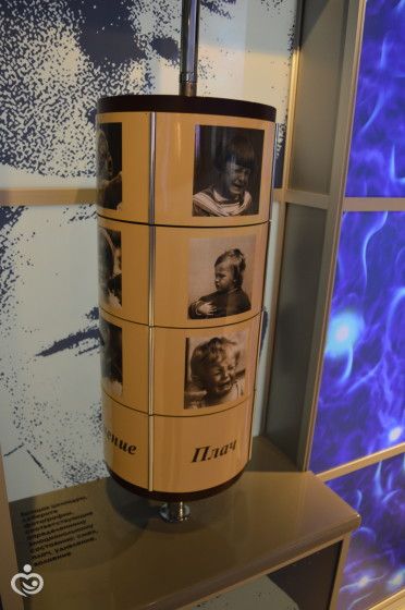 Эмоции. Нужно вращать части цилиндра, и сопоставить одинаковые эмоции, на фото есть и дети, и шимпанзе.